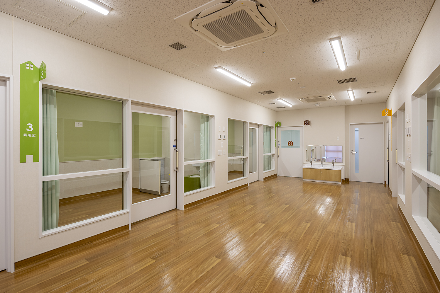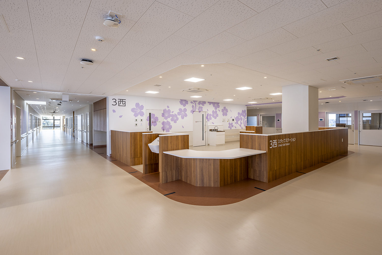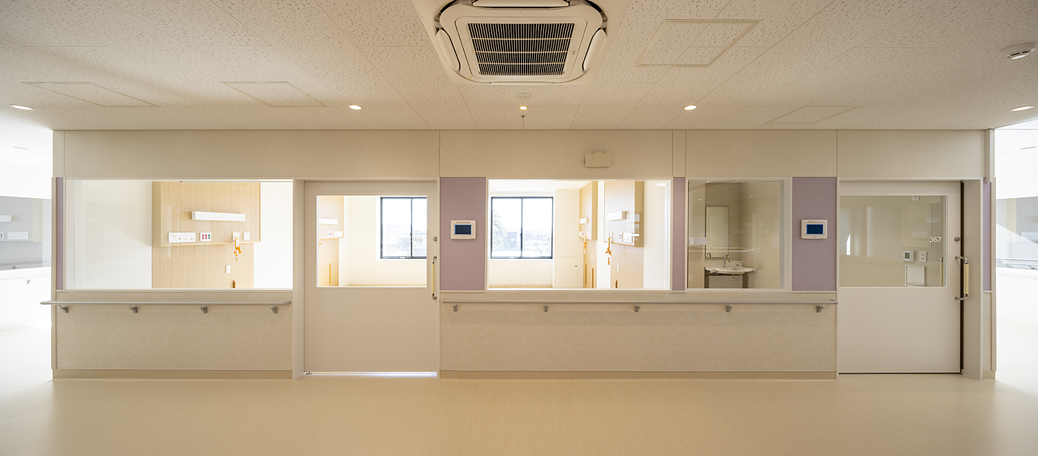2階・3階の病棟はスタッフが容易に看護・観察ができる「見守られる」病棟とすると共に、各病室は廊下側に大きなガラス窓を設け、常にスタッフから「見守られている安心感」を患者さんに与える計画です。また3階病棟では新型コロナウィルス等の感染拡大時の患者受け入れが可能なゾーン分けをあらかじめ想定し、感染リスクを低減した計画としました。