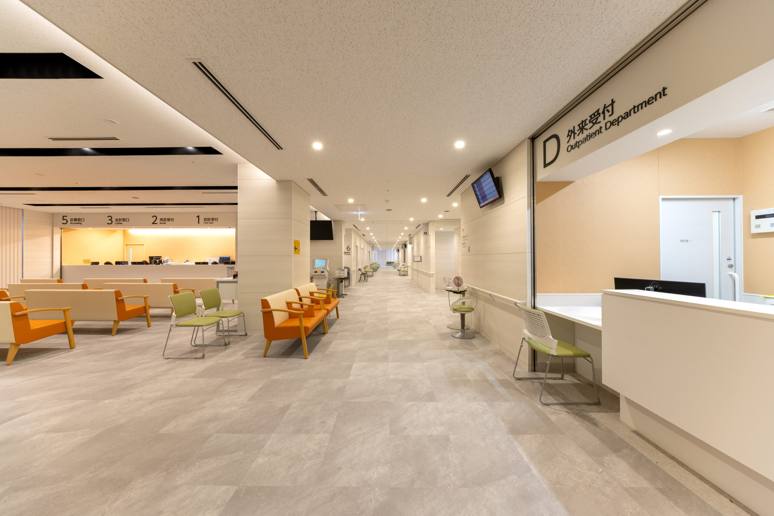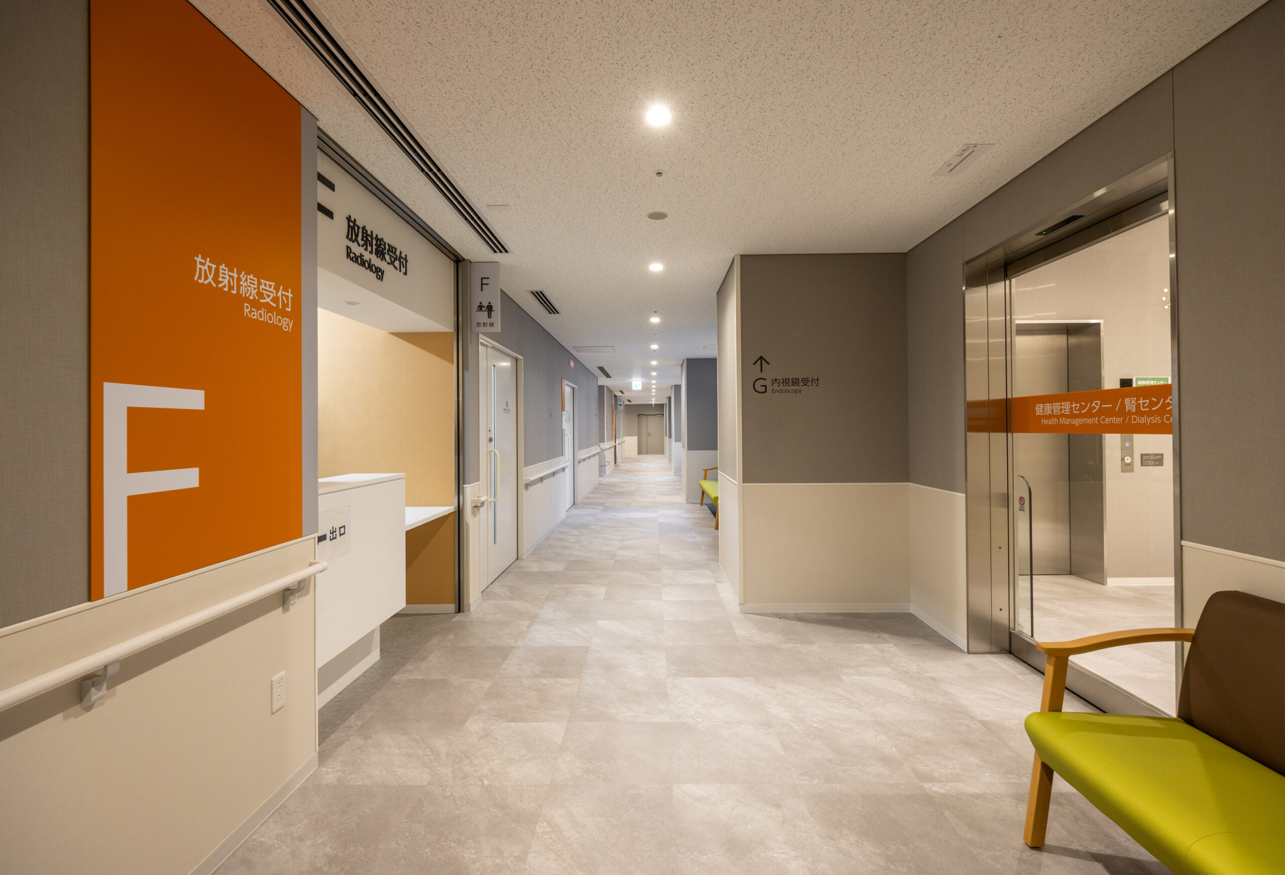 病棟を配置する敷地西側を高層化し良質な療養環境を整備すると共に、住宅地に面する敷地東側を低層とし周辺住環境に配慮しました。各階は、1階に外来・診療機能を集約配置、2階には一般来院者と動線分離した健診センターや透析センターを配置する等、明快な階構成とし、来院者とスタッフ双方に利便性の高い施設を実現しました。敷地内の高低差を利用して地階にスタッフ・サービス出入口を整備し来院者との動線分離を図る等、敷地条件や特性を最大限に活かした計画としています。