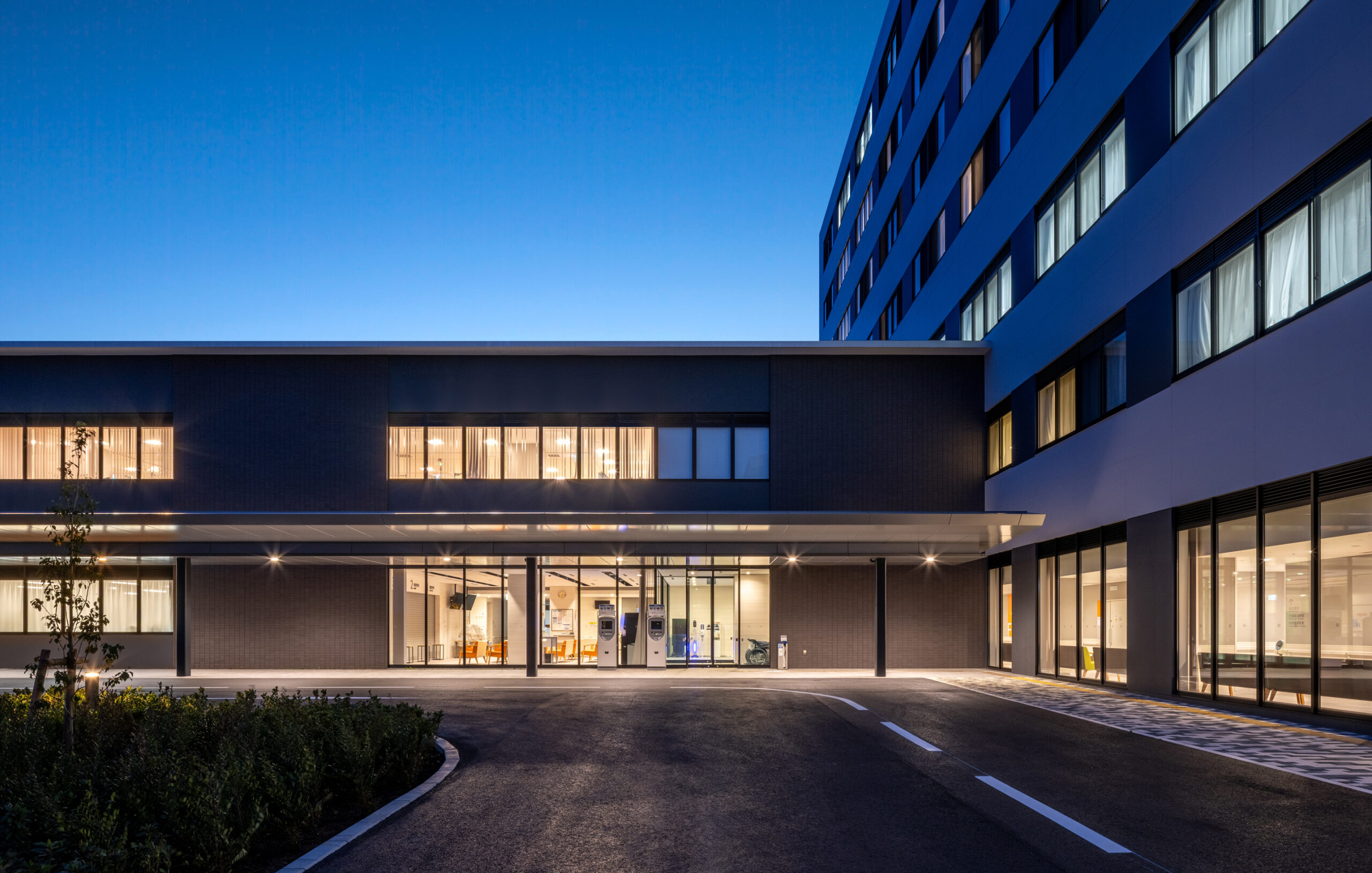 既存駐車場を利用した敷地内での現地建替えであり、高さ等の制限が多い敷地条件に対し、各種認定の取得や建物形状の工夫により、周辺環境と調和した地域医療のシンボルとなる病院を目指しました。